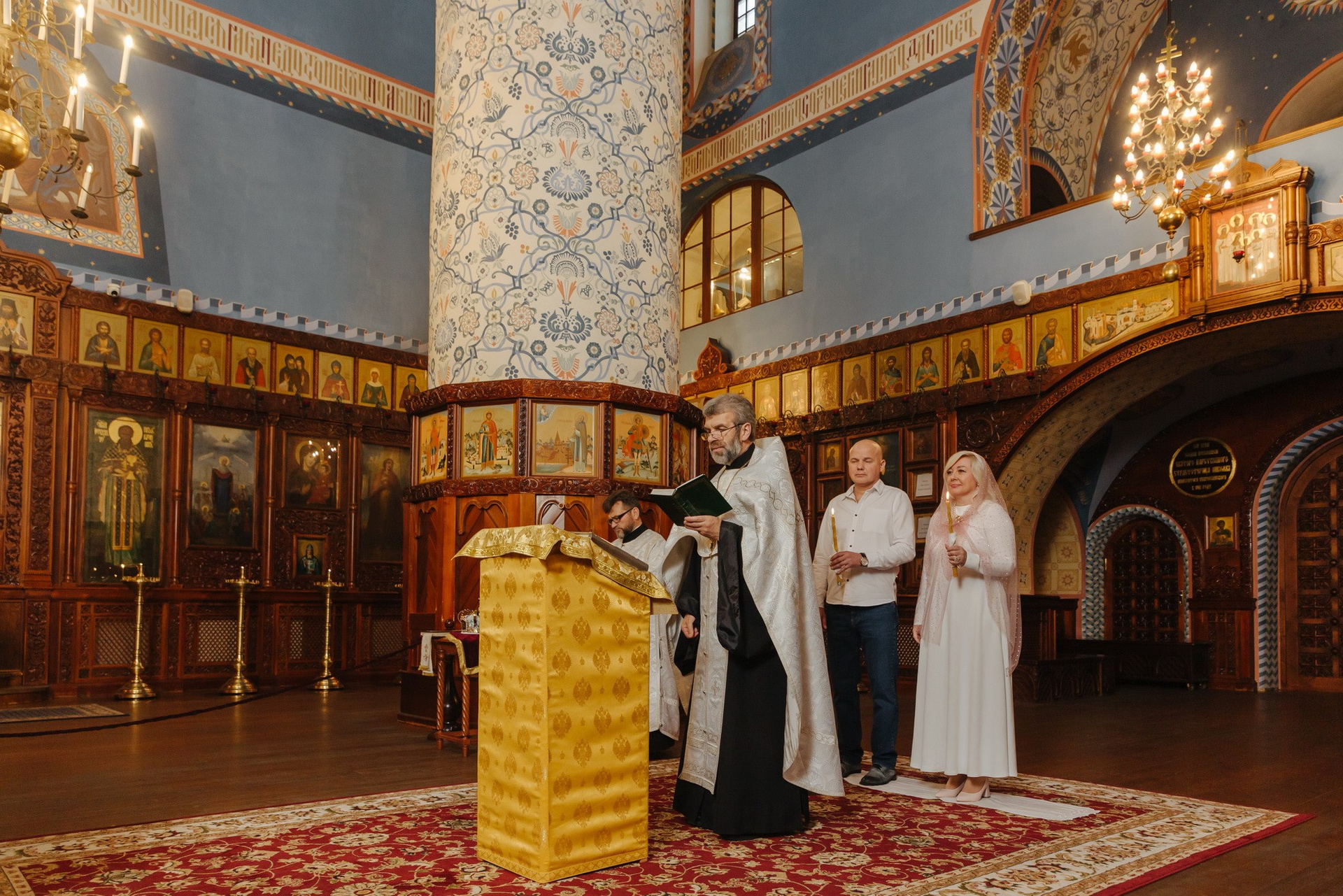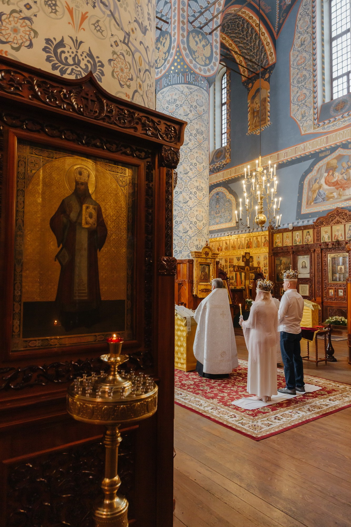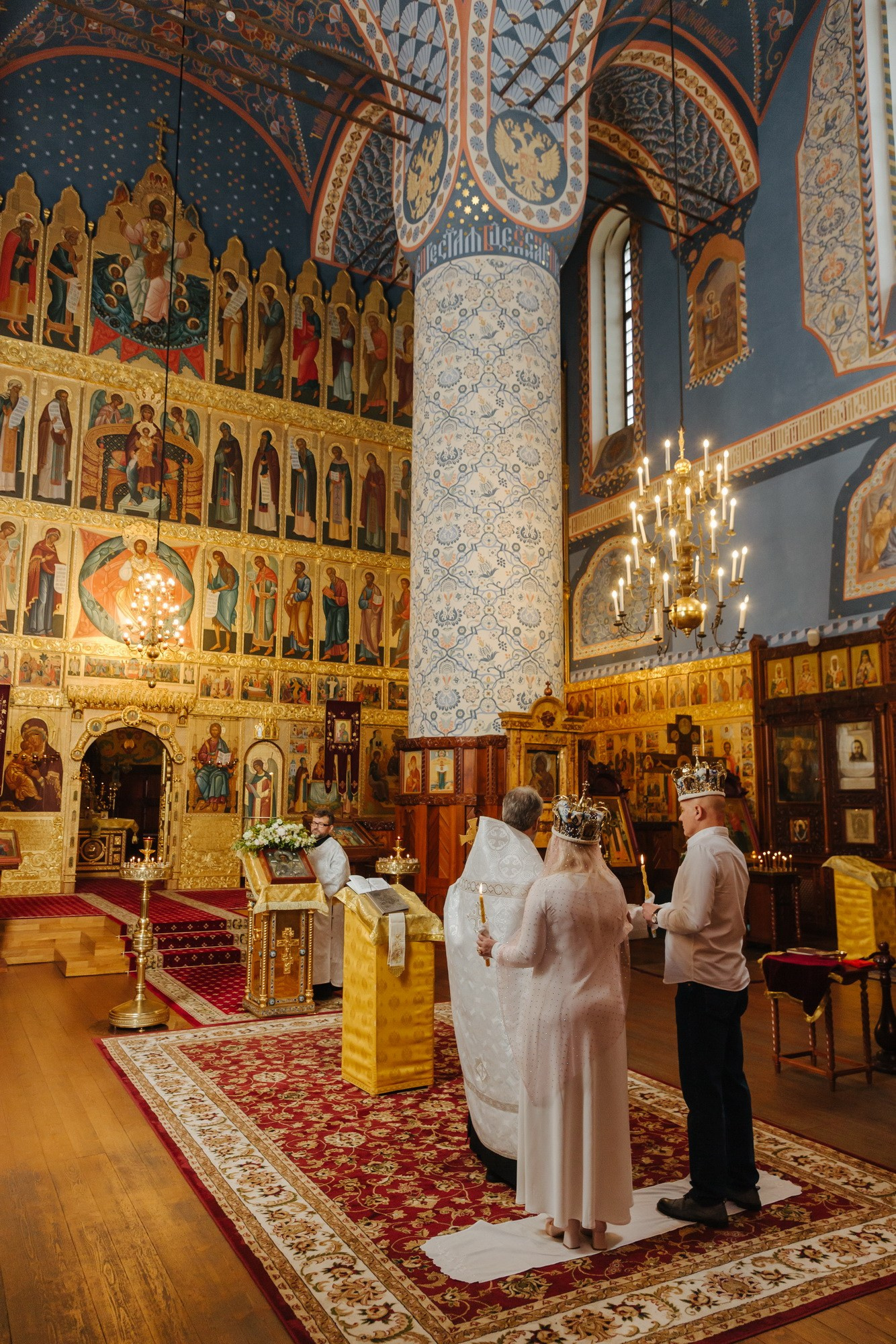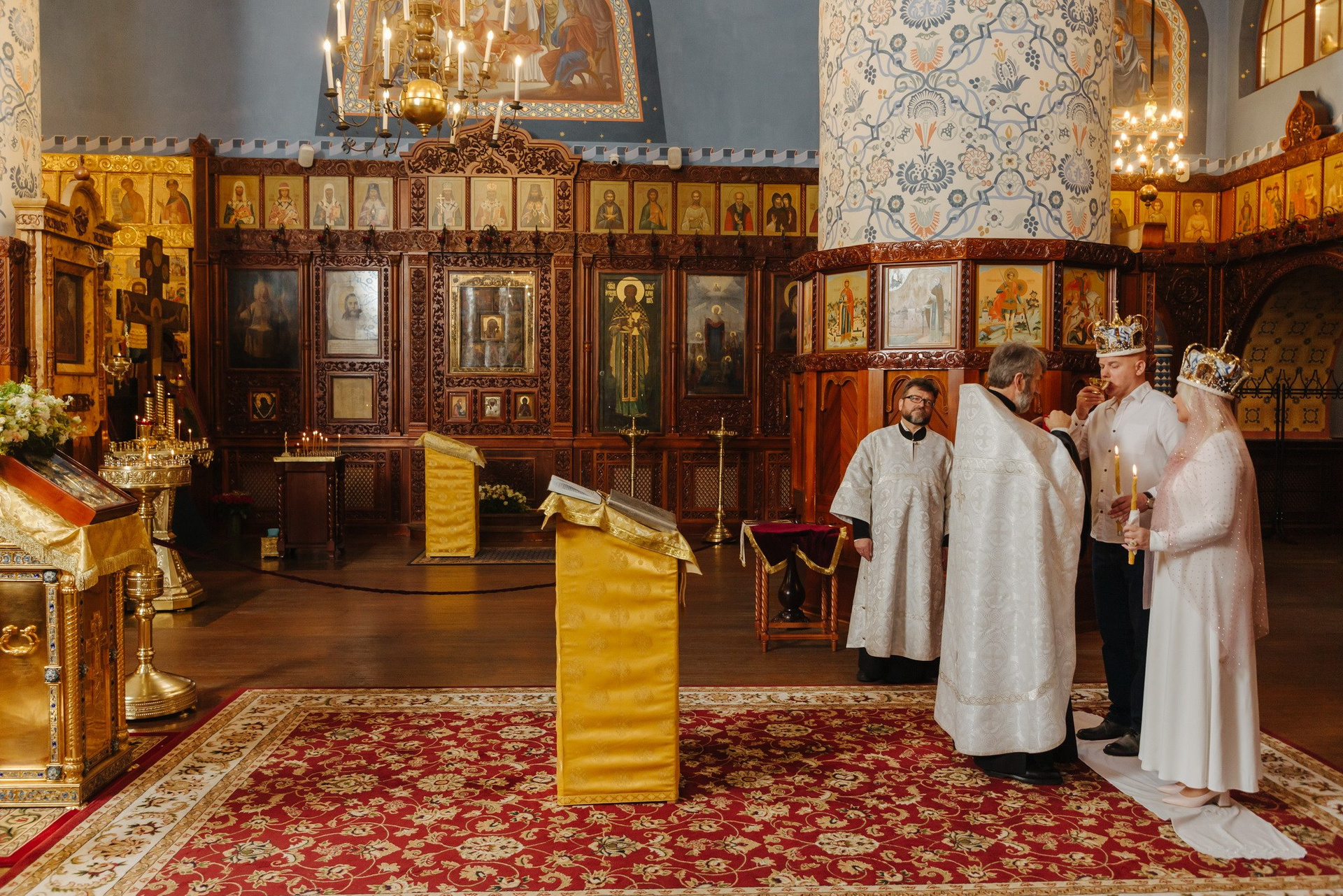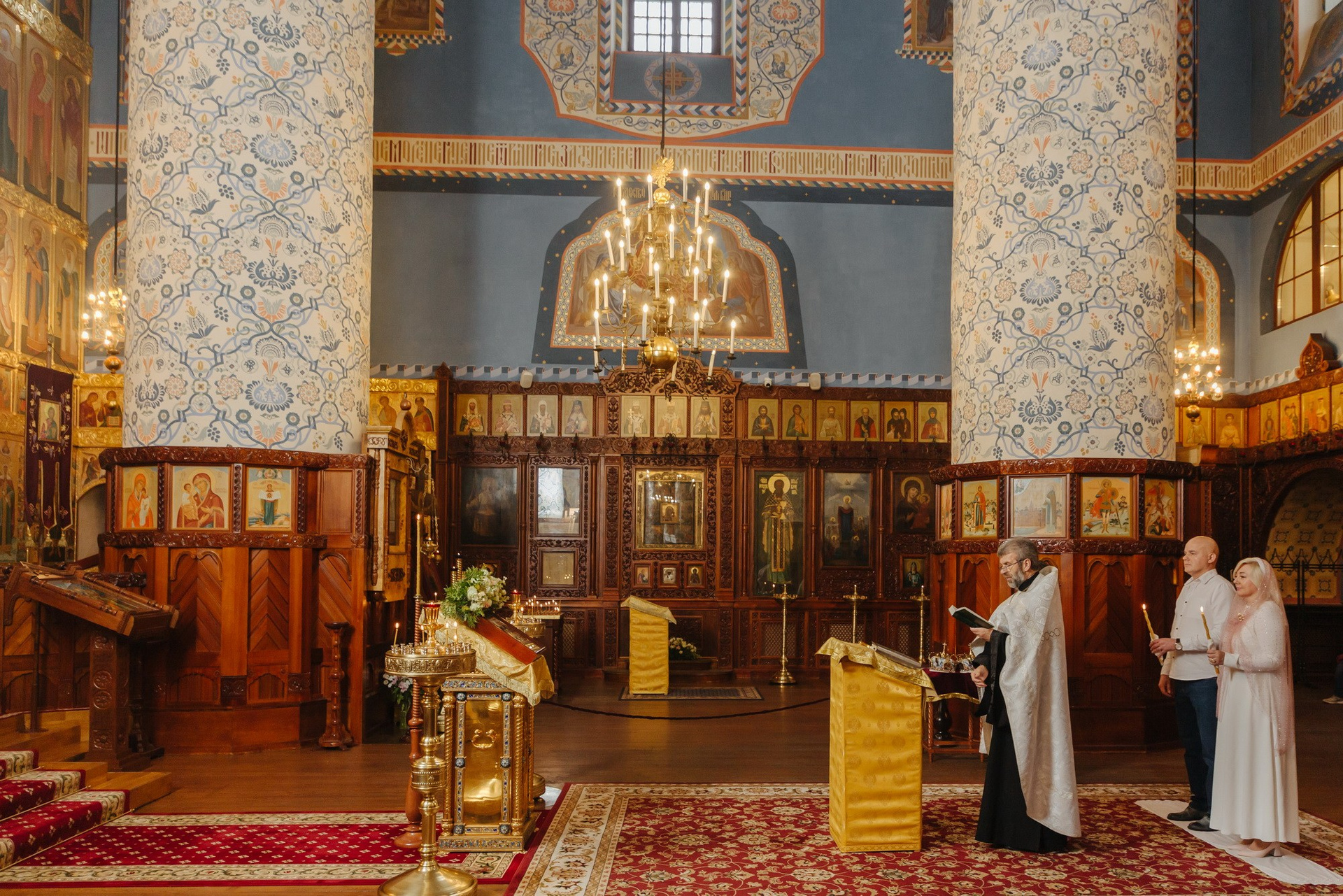 Венчание проходит в верхнем храме собора. Помещение светлое, просторное. Посетителей не так много (будни), продолжительность венчания порядка 45 минут. Стоимость на 2025 г 18 000 руб. Также возможно проведения венчания в нижнем храме собора, тут цена была озвучена 40 000 р.