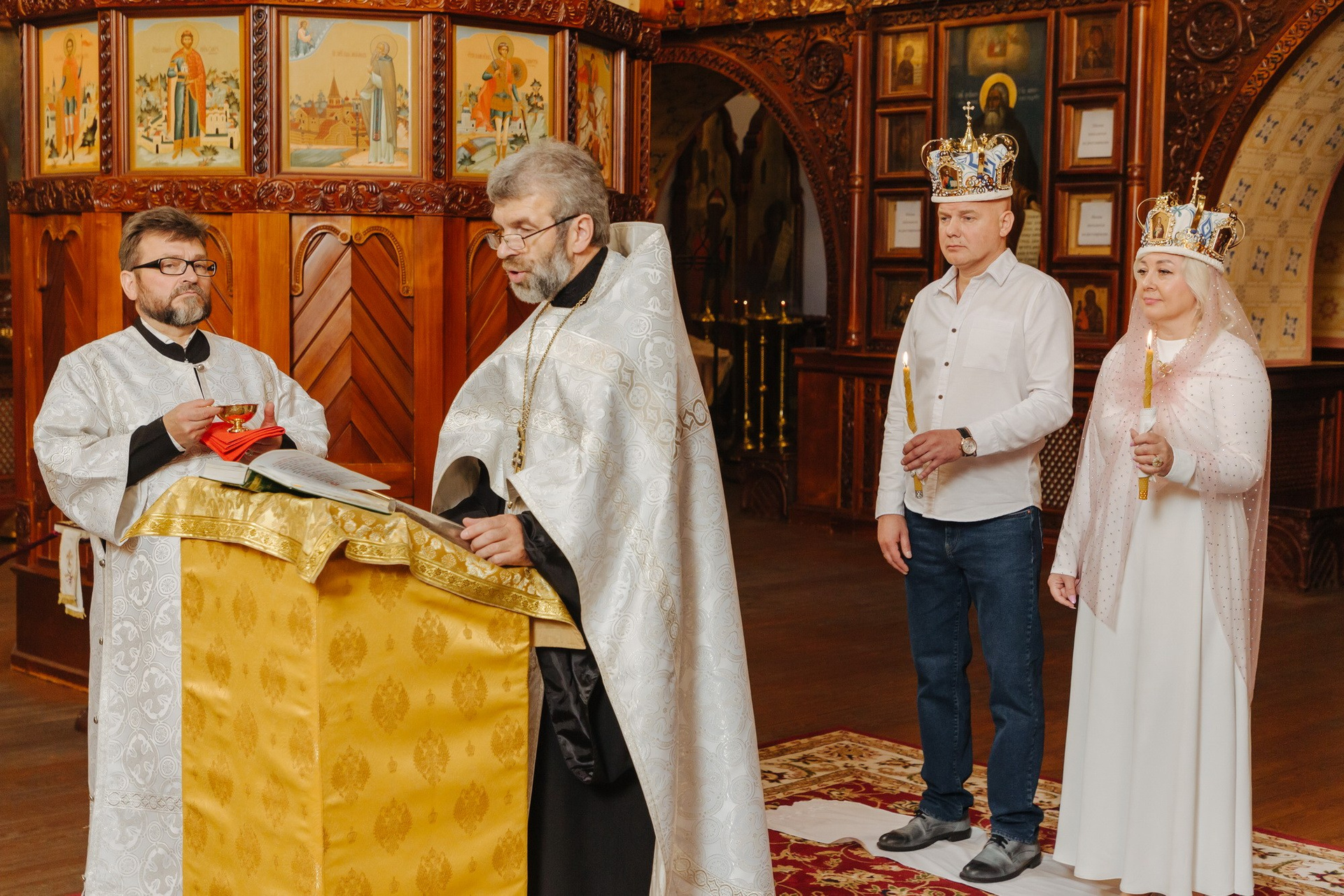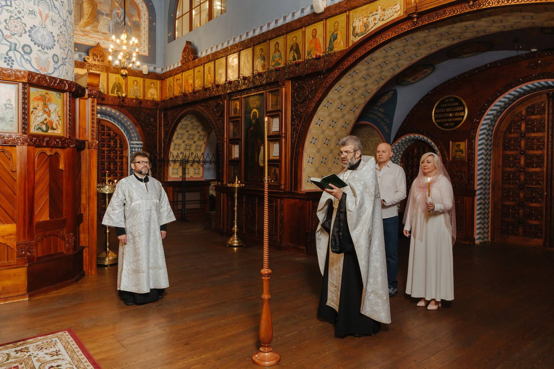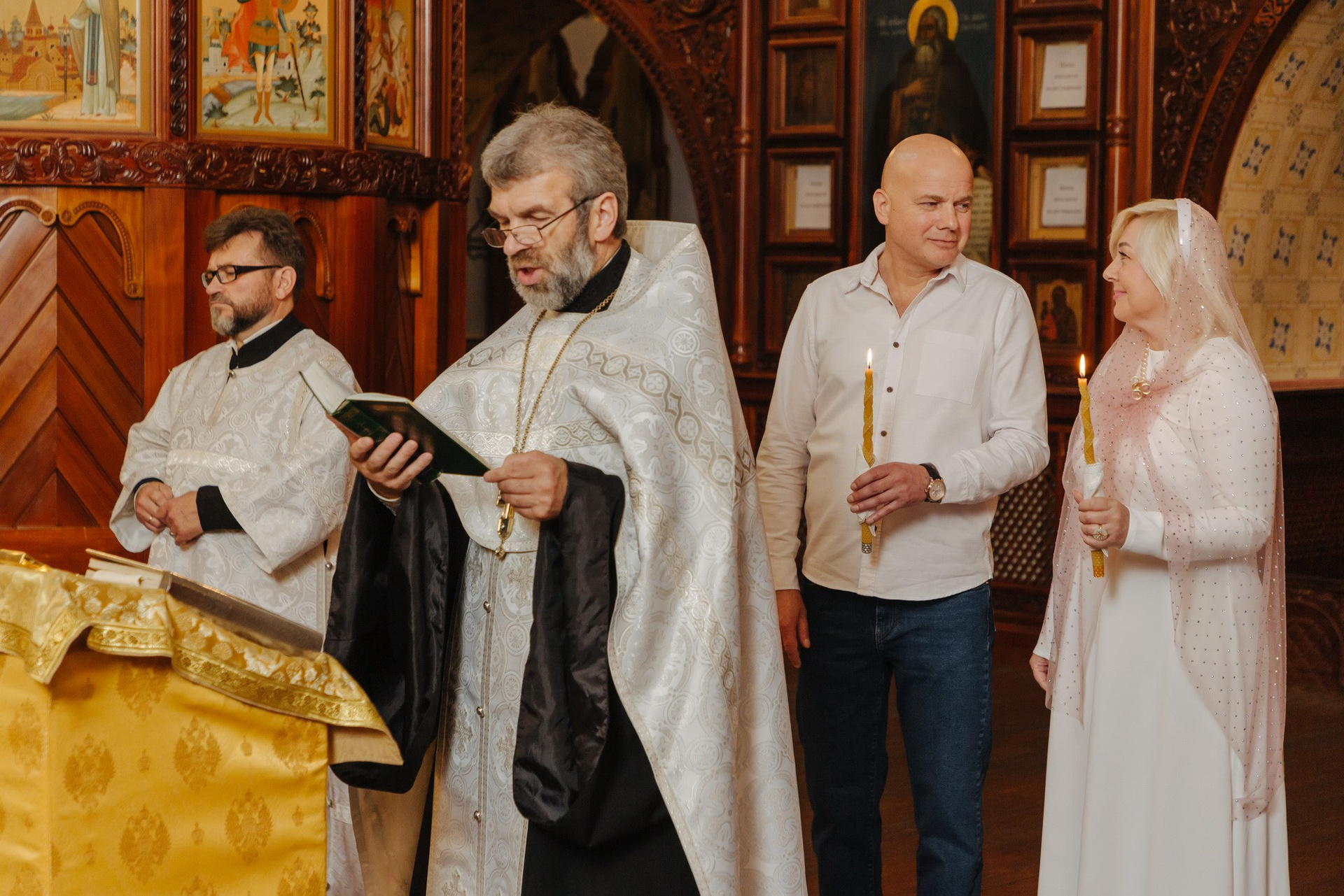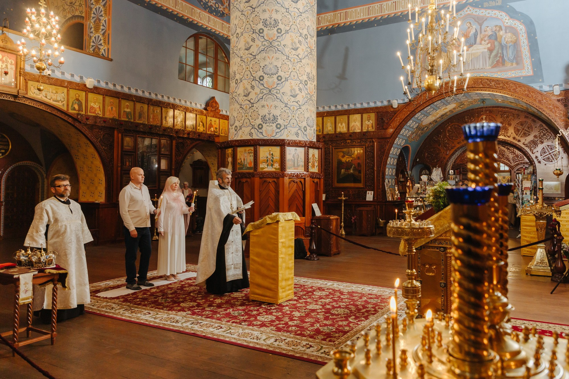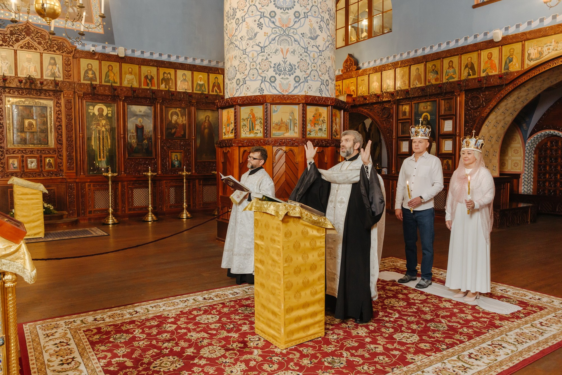 Венчание проходит в верхнем храме собора. Помещение светлое, просторное. Посетителей не так много (будни), продолжительность венчания порядка 45 минут. Стоимость на 2025 г 18 000 руб. Также возможно проведения венчания в нижнем храме собора, тут цена была озвучена 40 000 р.