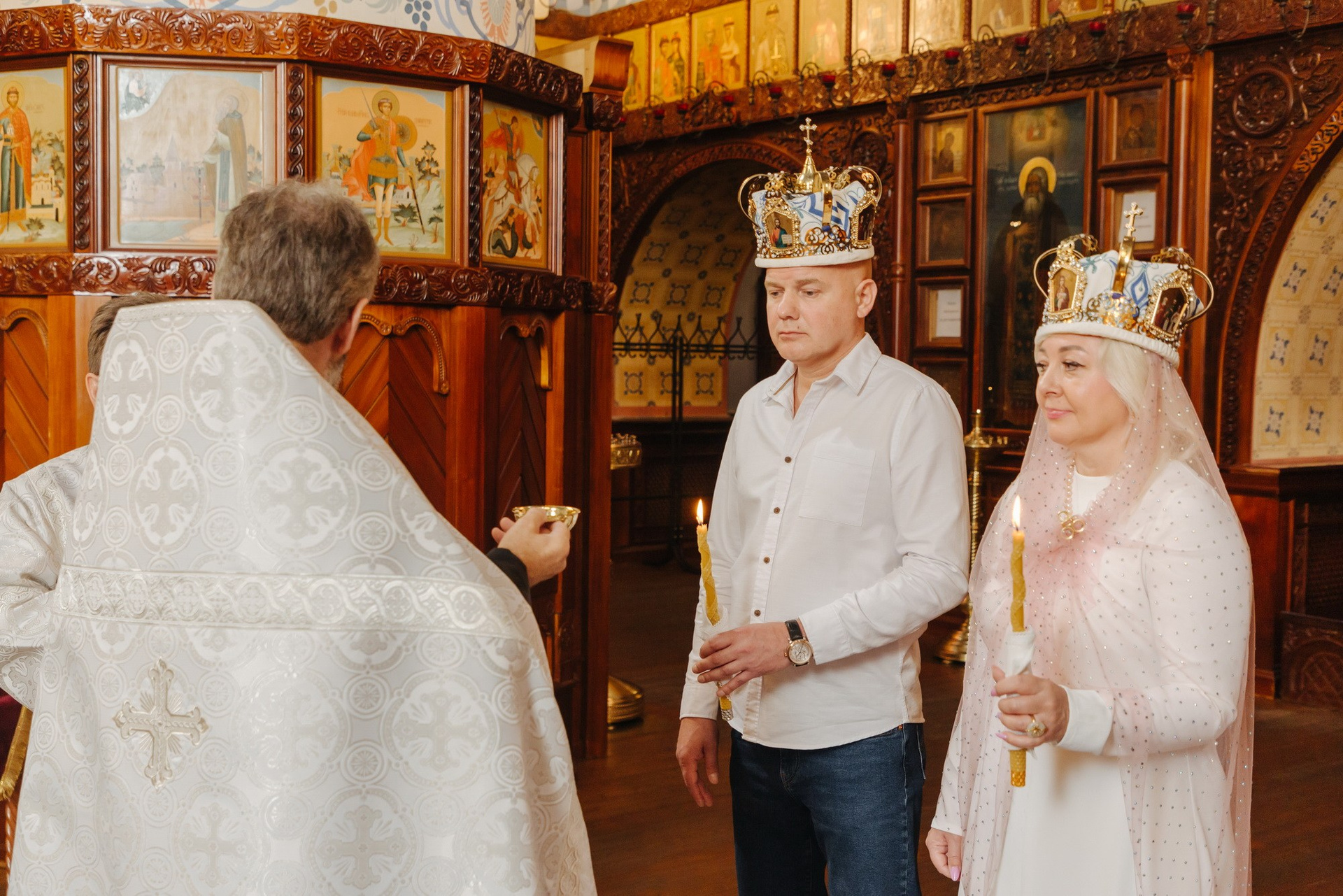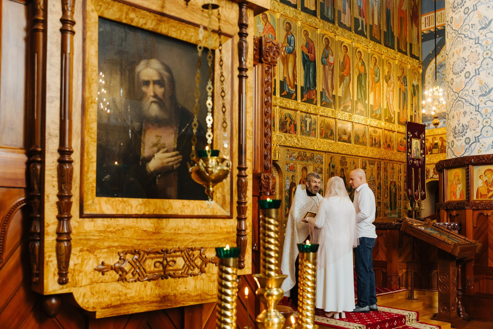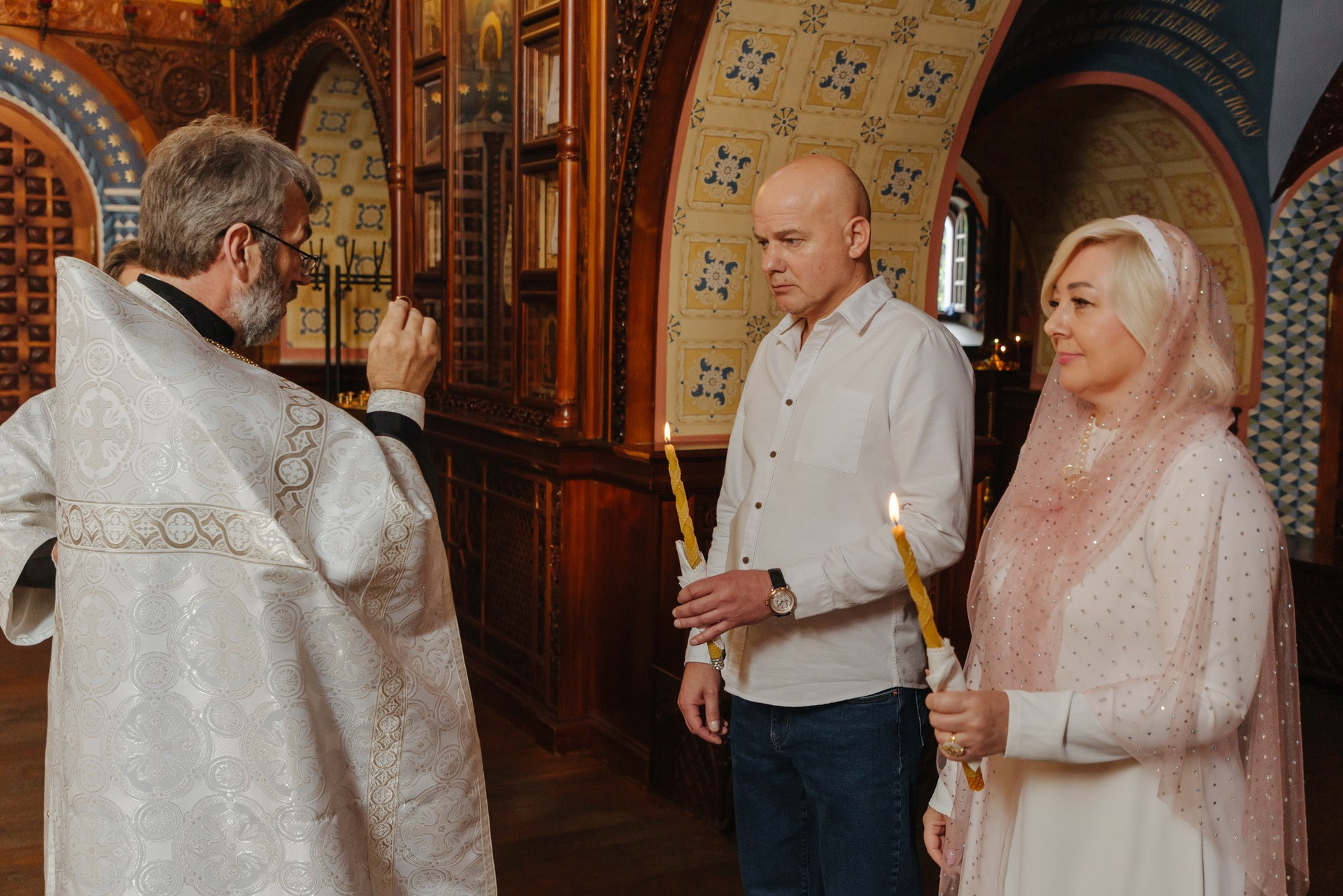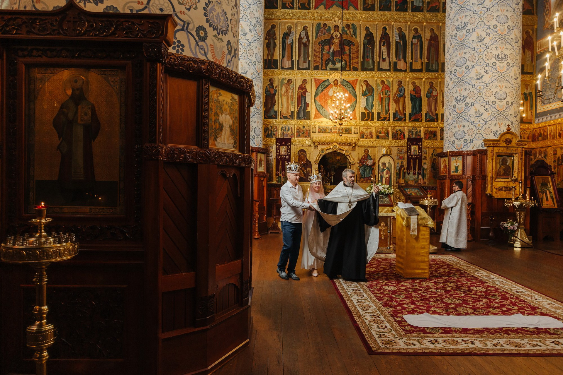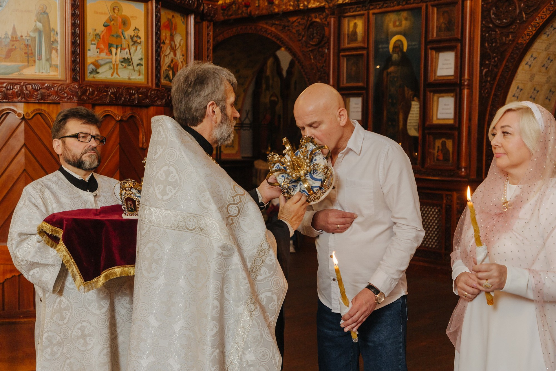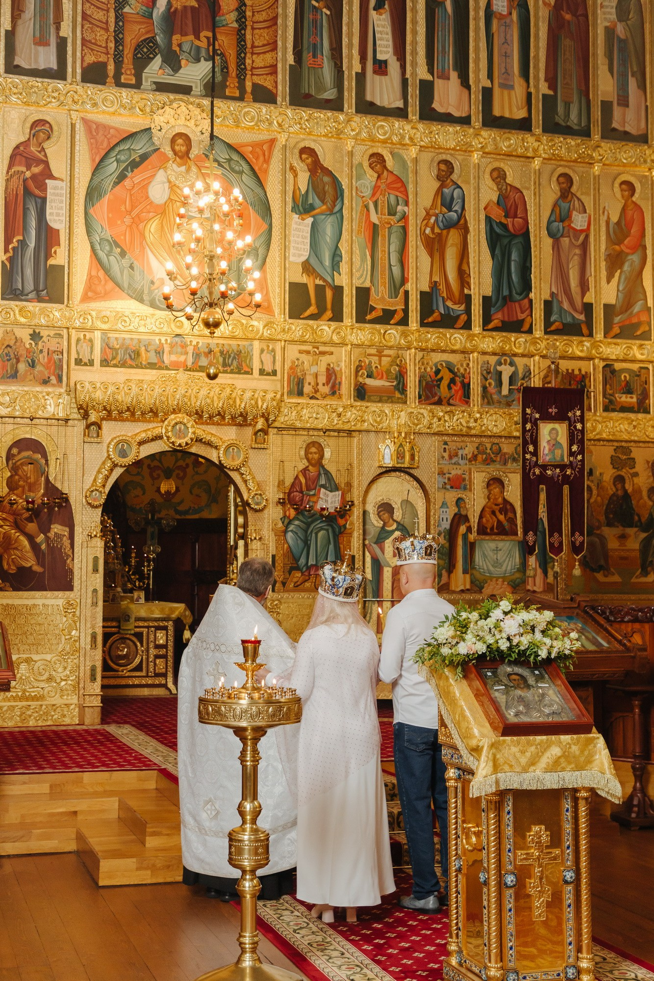 Венчание проходит в верхнем храме собора. Помещение светлое, просторное. Посетителей не так много (будни), продолжительность венчания порядка 45 минут. Стоимость на 2025 г 18 000 руб. Также возможно проведения венчания в нижнем храме собора, тут цена была озвучена 40 000 р.